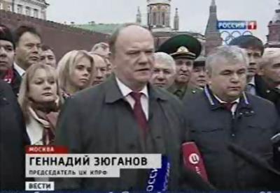 КОР: Красный галстук, праздничный костюм и праздничное настроение. Лидер партии КПРФ Геннадий Зюганов появился на Красной площади с гвоздиками в руках. Торжественное возложение цветов в честь Октябрьской революции 1917 года - обязательная традиция. На площади сотни коммунисты. В первую очередь обсуждали проблемы сегодняшнего дня.