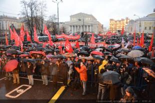 Задолго до объявленного начала мероприятия, несмотря на проливной и холодный дождь, на Пушкинской площади Москвы начали собираться люди. Комсомольцы и молодежь раздавали красные шарики с символикой КПРФ, коммунисты разворачивали флаги и транспаранты с лозунгами, выстраивались в колонны, чтобы пройти торжественным маршем до Площади Революции.