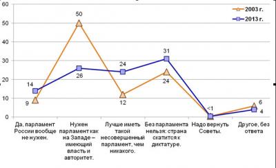 В то же время «нигилизм с оглядкой на Запад» теряет свои позиции. Мнение, будто бы «России не нужен именно такой какой сейчас парламент; а был бы у нас, как на Западе, то есть имеющий власть, влияние и авторитет, тогда другое дело», в 2003 году занимало половину умов, а в 2013-м – уже только четверть (рис.1).