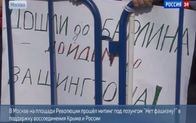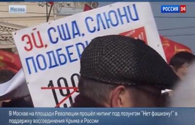 Среди наиболее примечательных народных лозунгов были "Крым не отдадим!", "С возвращением, Крым!", "Янки, гоу хоум!", "Дошли до Берлина - дойдем и до Вашингтона!", "Эй, США, слюни подбери!", "Нет фашизму!" и др