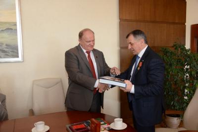 В.И. Володин вручил лидеру КПРФ наградной лист его отца – старшего сержанта Андрея Михайловича Зюганова, тяжело раненного под Севастополем в 1942 году и удостоенного медали «За отвагу». Документ обнаружила в архивах заместитель директора музея Т.И. Уманская, а его копию первой доставила в Москву певица Вика Цыганова.