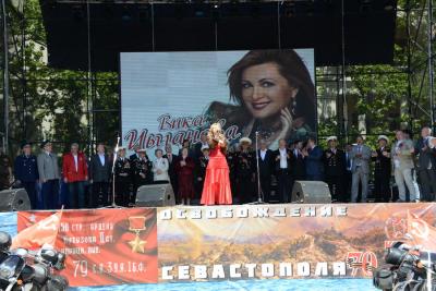 Замечательной певицей Викой Цыгановой была исполнена легендарная «Катюша», патриотические произведения, такие как «Андреевский флаг», «Вернусь в Россию», «Крым». Прямо во время концерта лидер КПРФ Г.А. Зюганов вручил В.Ю. Цыгановой и ее мужу, автору песен В.Б. Цыганову памятные медали ЦК КПРФ в честь 70-летия освобождения Крыма и Севастополя от немецко-фашистских захватчиков.
