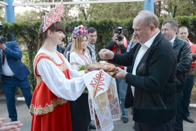 4 мая в аэропорту Симферополя Председателя ЦК КПРФ и сопровождающих его депутатов фракции КПРФ в Государственной Думе торжественно встретили крымские коммунисты и комсомольцы. Г.А. Зюганову были вручены традиционные хлеб-соль.