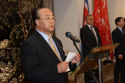 В церемонии приняли участие Чрезвычайный и Полномочный Посол КНДР в России Ким Ен Дже, заместитель Председателя ЦК КПРФ Д.Г. Новиков, первый заместитель Председателя Совета СКП-КПСС, секретарь ЦК КПРФ К.К. Тайсаев, член Президиума, секретарь ЦК КПРФ Л.И. Калашников, член Президиума ЦК КПРФ А.Е. Клычков, секретарь ЦК КПРФ М.С. Костриков, депутаты Госдумы В.Р. Родин, А.А. Ющенко и руководитель аппарата фракции КПРФ в Госдуме Н.А. Останина.