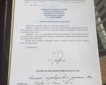 Патриарх Московский и Всея Руси Кирилл поздравил с Днем рождения лидера КПРФ Г.А. Зюганова. Публикуем текст поздравления.