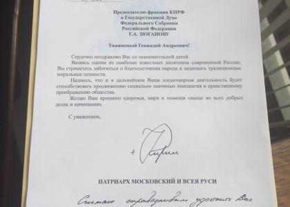 Представитель РПЦ огласил поздравление Патриарха Московский и Всея Руси Кирилла Г.А. Зюганову.