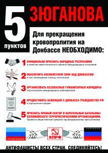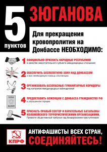 Лидер российских коммунистов предложил пять конкретных мер для прекращения кровопролития на юго-востоке Украины.