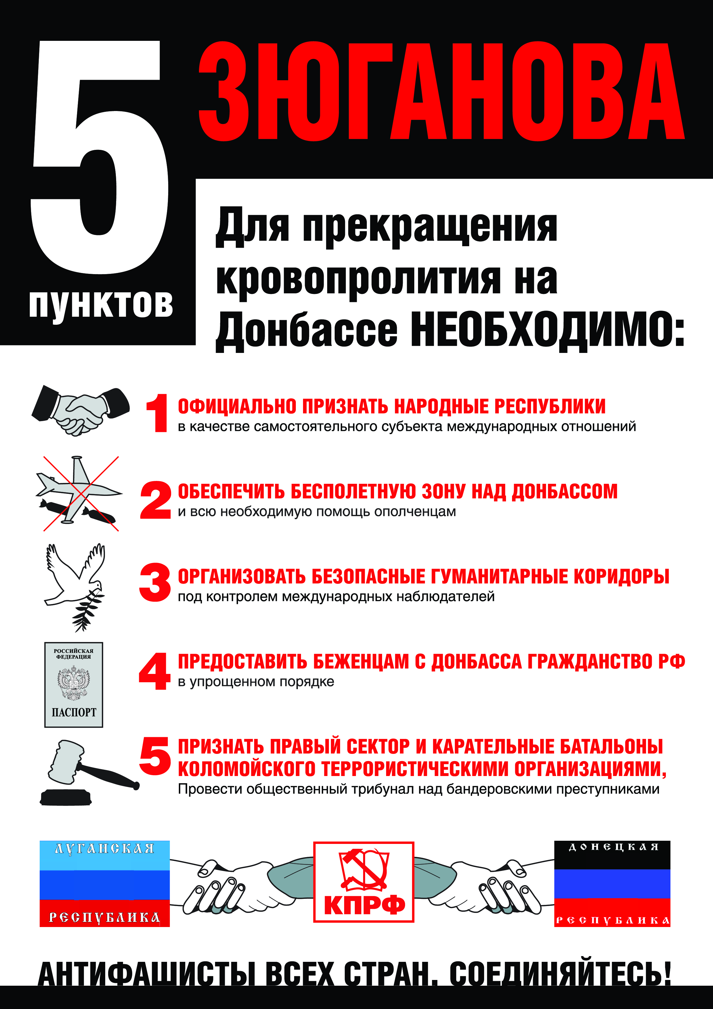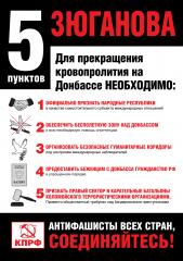 Первая листовка посвщена пяти требованиями Зюганова, выполнение которых позволит прекратить кровопролитие на Донбассе.