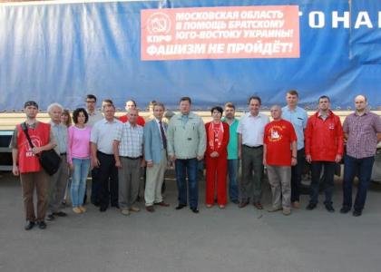 В среду, 20 августа, с территории подмосковного совхоза им. Ленина в очередной раз выехали головные машины автоколонны, груженые продовольствием и медикаментами, собранными коммунистами Москвы и Московской области для ополченцев и жителей Донбасса. По пути следования к границе с Новороссией к ним присоединятся автомобили из других регионов.