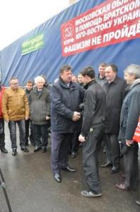 К присутствующим обратился заместитель Председателя ЦК КПРФ Владимир Кашин: «Это уже семнадцатый гуманитарный конвой в помощь жителям Новороссии и бойцам, защищающим мир и независимость Народных Республик от фашизма и бандеровщины. Мы уже отправили 1700 тонн гуманитарного груза и не будем на этом останавливаться. Множество неравнодушных людей откликнулись на беду братского народа и приняли активное участие в формировании гуманитарных конвоев, которые очень востребованы жителями и ополченцами Новороссии.
