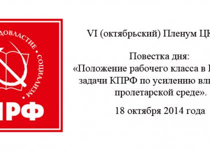 18 октября в Подмосковье открылся VI (октябрьский) Пленум ЦК КПРФ. С отчетным докладом выступает Председатель ЦК КПРФ Г.А. Зюганов. Тема его доклада: «Положение рабочего класса в России и задачи КПРФ по усилению влияния в пролетарской среде».