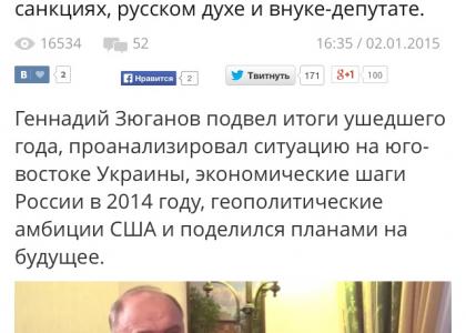 Геннадий Зюганов подвел итоги ушедшего года, проанализировал ситуацию на юго-востоке Украины, экономические шаги России в 2014 году, геополитические амбиции США и поделился планами на будущее.