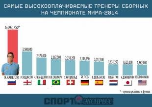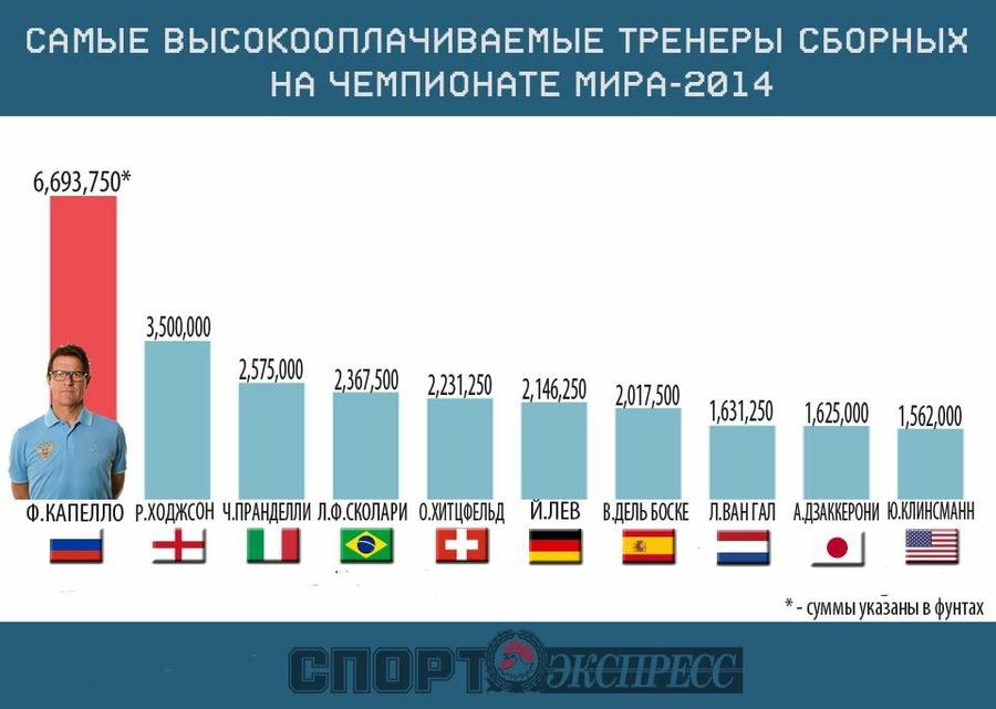 Ярким примером является сборная России по футболу, в которой тренер Фабио Капэлла получает 6 693 750 фунтов, а годовой оклад нападающего сборной России Александра Кокорина составляет 5 миллионов евро.