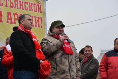 Затем слово предоставили представителю ополчения Донецкой народной республики А.А. Тараненко. Он горячо поблагодарил КПРФ за оказываемую Новороссии гуманитарную помощь. «Донбасс никто никогда не поставит на колени. Скоро мы очистим территорию нашей республики от киевской хунты»,- заверил участников митинга оратор.