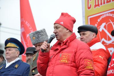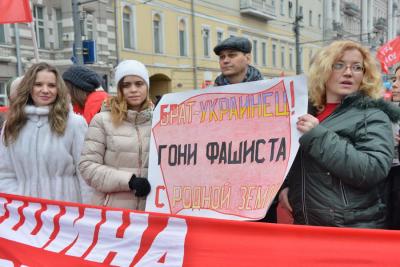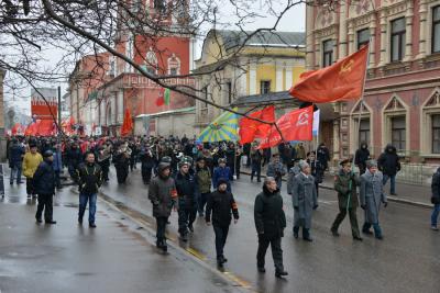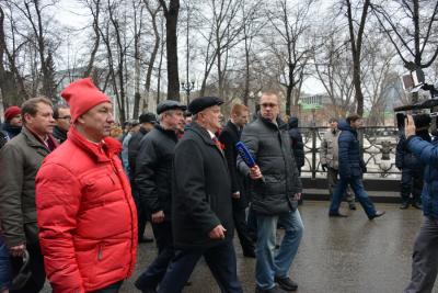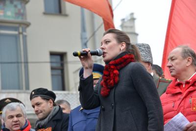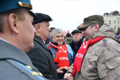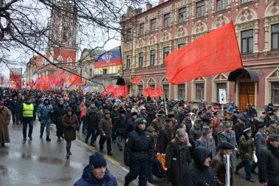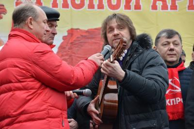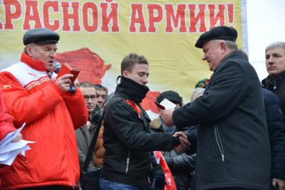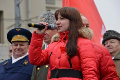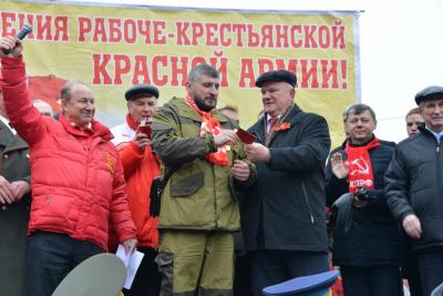 После этого выступил комиссар добровольческого коммунистического отряда в Луганской Народной Республике Алексей Марков. Сегодня ополченцы Новороссии продолжают славное дело своих дедов и прадедов, защитивших революцию и отстоявших в боях и походах социалистическое Отечество. Алексей Марков рассказал, что его коммунистический отряд на днях водрузил на одном из строений в Дебальцево Красное знамя. Под одобрительные аплодисменты участников митинга он пообещал водрузить такие же красные знамена над Киевом и Львовом. Вот тогда, по его мнению, молодое поколение будет по-настоящему достойно подвига своих дедов и прадедов.
