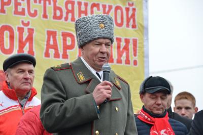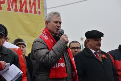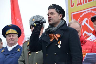 На трибуну поднялся депутат Госдумы А.А. Ющенко. Накануне он вернулся из Луганска, где принимал участие в учредительном съезде движения «Мир Луганщине». Он провел исторические параллели с 1918 годом. Как и 97 лет назад, сегодня на Донбассе взялись за оружие рабочие, крестьяне, учителя и врачи, чтобы отстоять свою землю и право на достойную жизнь. Он продекламировал знаменитые строки Александра Пушкина «Клеветникам России».