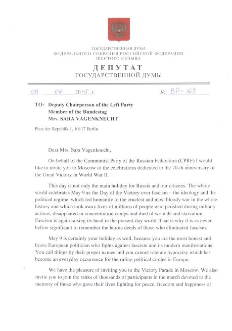 Заместитель Председателя ЦК КПРФ, первый заместитель Председателя Комитета Госдумы по делам национальностей Валерий Рашкин направил Саре Вагенкнехт официальное приглашение на празднование 70-летия Великой Победы в Москве.