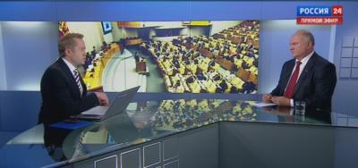 В пятницу, 29 мая, Председатель ЦК КПРФ Г.А. Зюганов выступил в прямом эфире на телеканале "Россия 24". Основными вопросами обсуждения стали перенос думских выборов с декабря на сентябрь 2016 года, проблемы во внешней и внутренней политике нашей страны, а также ситуация на Украине.