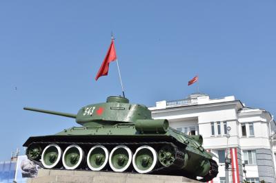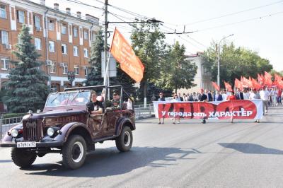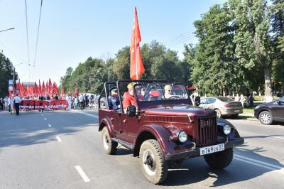 колонна под красными флагами двинулась по улицам города к скверу Танкистов. В