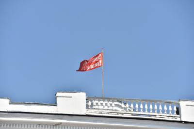 крышу дома №5 на площади Мира по давней традиции был водружен дубликат Знамени