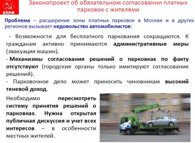 населением строительства платных парковок. Мы внесли также законопроект о