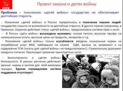 «Это законопроект о «заморозке» тарифов ЖКХ, - продолжил Сергей Павлович. - Законопроект о передаче конфискованных санкционных продуктов малоимущим гражданам. Мы считаем, что качественная еда не должна уничтожаться».