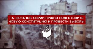 РИА Новости. Первоочередной задачей для Сирии сейчас является продолжение политического процесса, подготовка новой редакции конституции и организованное проведение выборов, считает лидер КПРФ Геннадий Андреевич Зюганов.