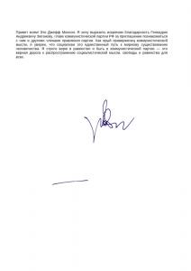 Привет всем, это Джефф Монсон! Я хочу выразить искреннюю благодарность Геннадию Андреевичу Зюганову, главе Коммунистической партии РФ за приглашение познакомиться с ним и другими членами правления партии. Как ярый приверженец коммунистической мысли я уверен, что социализм - это единственный путь к мирному существованию человечества. Я строго верю в равенство, и быть в Коммунистической партии – это верная дорога к распространению социалистической мысли, свободы и равенства для всех.