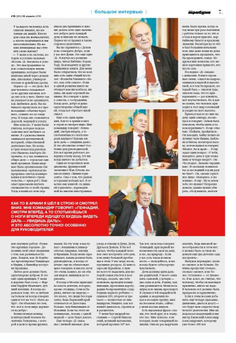 Ещё есть один принцип. Как-то в армии я шёл в строю и смотрел вниз. Мне командир говорит: «Геннадий, смотри вперёд, а то спотыкнёшься о ноги впереди идущего! Будешь видеть даль — увидишь даль!». И это абсолютно точно! Особенно для руководителей. Кто всё время работает, повернув голову назад, тот никогда ничего не добьётся.