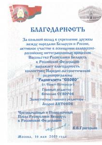 Сотрудничество нашего радио с Российско-Белорусским братством особенно важно в деле укрепления Союзного государства, за это спасибо А.В.Воронцову — председателю Братства. Хочется поблагодарить и наших партнеров, весь коллектив «Православного радио Санкт-Петербурга», за четкую и слаженную работу и особенно - Сергея Евгеньевича Васильева – его руководителя.