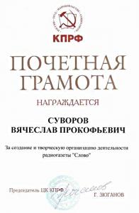 С уважением, ко всем главный редактор «Радиогазеты «Слово» - член КПСС с 1987г., КПРФ с 1993г. - Вячеслав Прокофьевич Суворов; заместитель главного редактора, член КПРФ, исполнительный секретарь СПб отделения ВСД «Русский Лад» Алексей Михайлович Богачев.