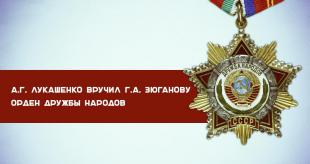 Президент Беларуси Александр Лукашенко вручил сегодня Председателю Коммунистической партии Российской Федерации Геннадию Зюганову орден Дружбы народов, передает корреспондент БЕЛТА.