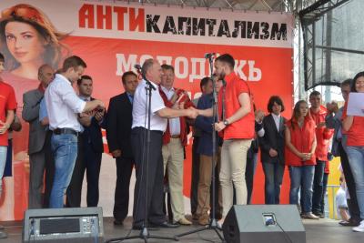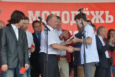 После этого лидер российских коммунистов вручил на сцене партийные и комсомольские билеты новым боевым товарищам.