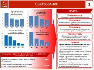 В федеральном бюджете 2016 года расходы на образование составляют лишь 3,6% от расходной части. При этом сокращаются программные расходы бюджета на реализацию образовательных программ профессионального образования (-8%), а также на содействие развитию дошкольного и общего образования (-96%).