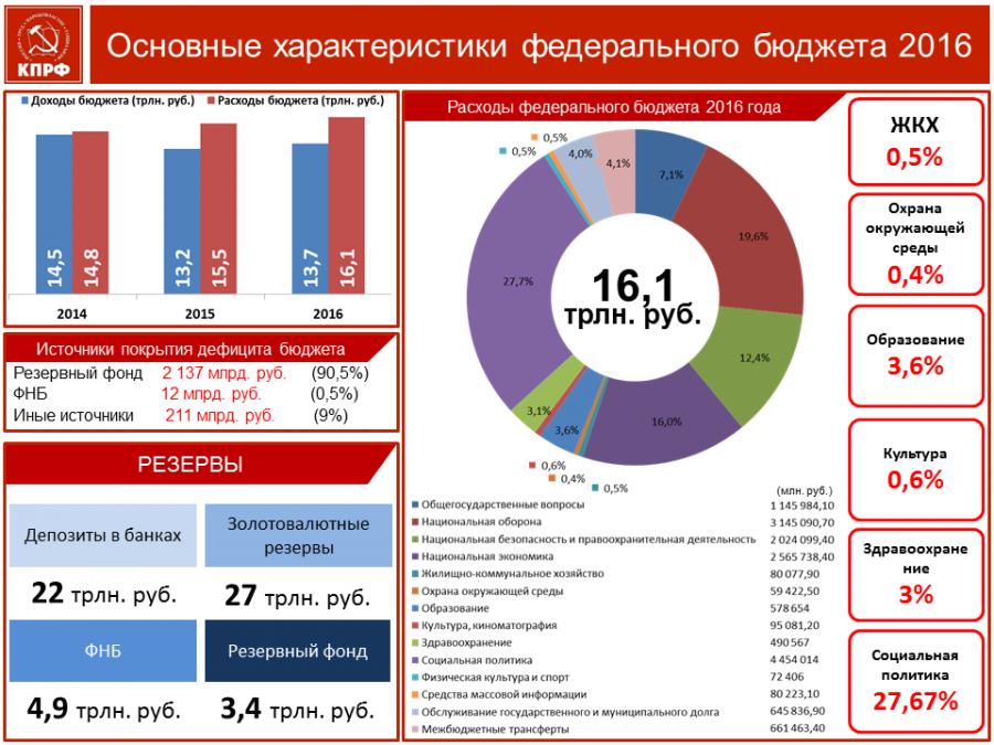 Текущий бюджет, в рамках которого на ЖКХ идет 0,5% расходов, на охрану окружающей среды – 0,4%, на образование – 3,6%, на культуру – 0,6%, а на здравоохранение – 3% не может быть признан эффективным ни с социальной, ни с экономической точек зрения.