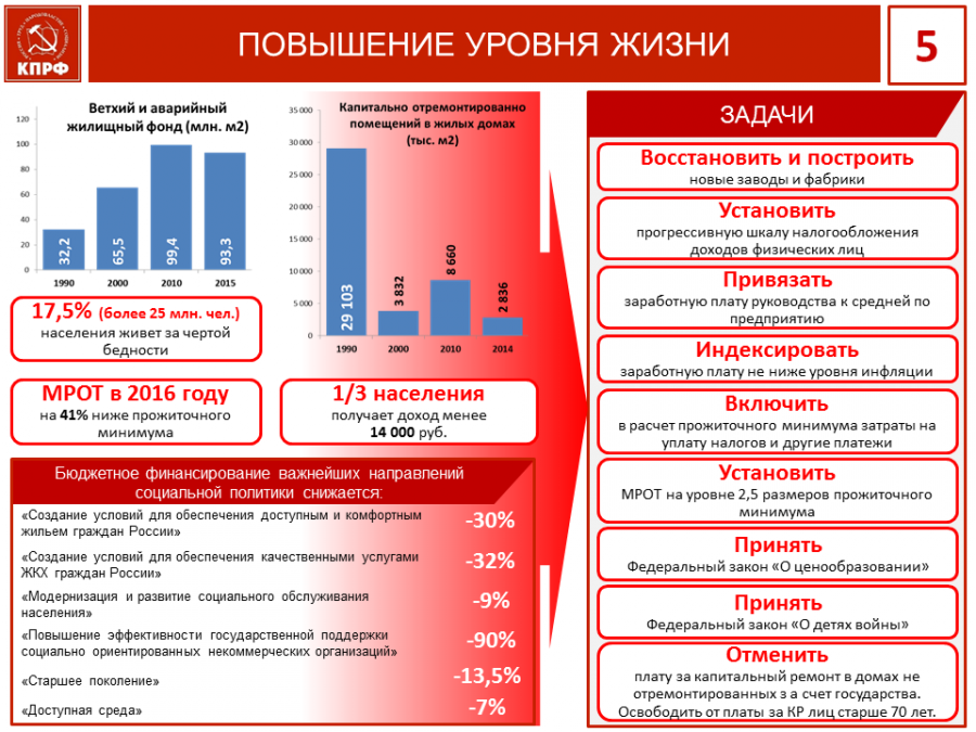 Намеренному разрушению страны, продолжающемуся уже четверть века, пора положить конец. Коммунистическая партия Российской Федерации предлагает свою программу по преодолению кризиса в социальной сфере и коренного изменения социальной политики в интересах народа.