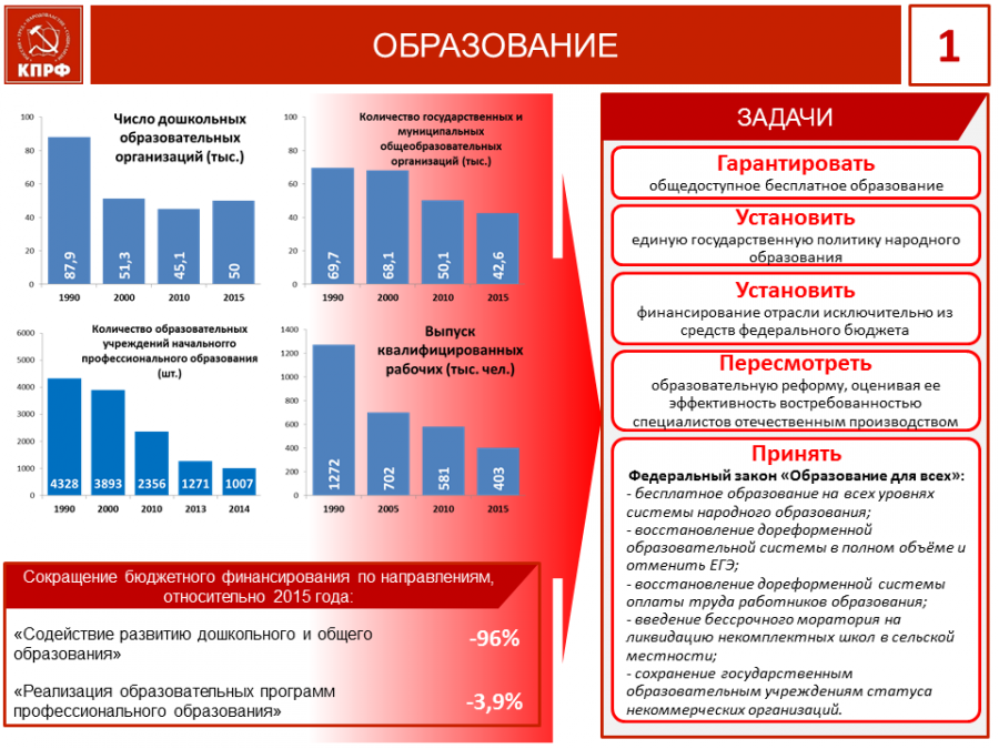 Законодательно установить единую государственную политику народного образования. Финансирование этой отрасли должно осуществляться только из федерального бюджета.