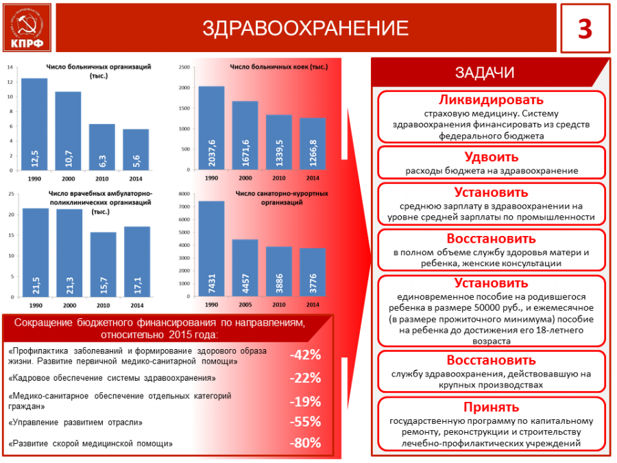 - принять государственную программу по капитальному ремонту, реконструкции и строительству лечебно-профилактических учреждений за счёт федерального бюджета. Гарантировать получение высокотехнологичной медицинской помощи на территории всех субъектов Российской Федерации за счёт ежегодных инвестиций на эти цели в размере не менее 100 млрд. рублей;
