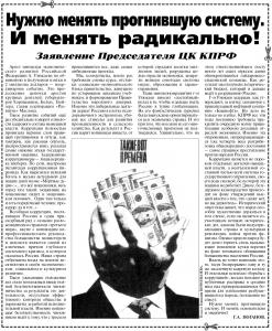 7 ноября в газете «Правда» опубликована листовка с заявлением Председателя ЦК КПРФ Г.А. Зюганова «Нужно менять прогнившую систему. И менять радикально!».
