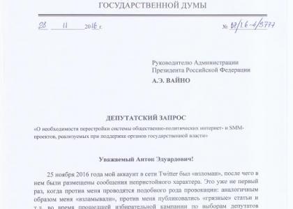 Ранее Рашкин уже сделал заявление на эту тему, а 28 ноября отправил обращение в администрацию президента, в котором призвал главу администрации Антона Вайно перестроить систему интернет и- smm-проектов, реализуемых при поддержке органов государственной власти.