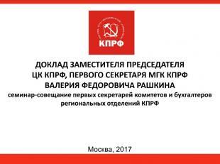 В Подмосковье 27-28 января 2017 года проводился семинар-совещание первых секретарей комитетов и бухгалтеров региональных отделений КПРФ. 28 декабря выступил заместитель Председателя ЦК КПРФ В.Ф. Рашкин с докладом на тему: «О плане мероприятий по подготовке к празднованию 100-летия Великой Октябрьской социалистической революции».
