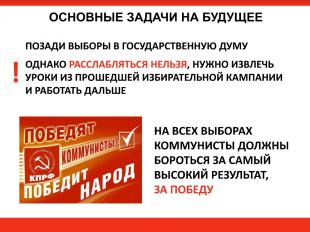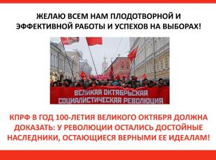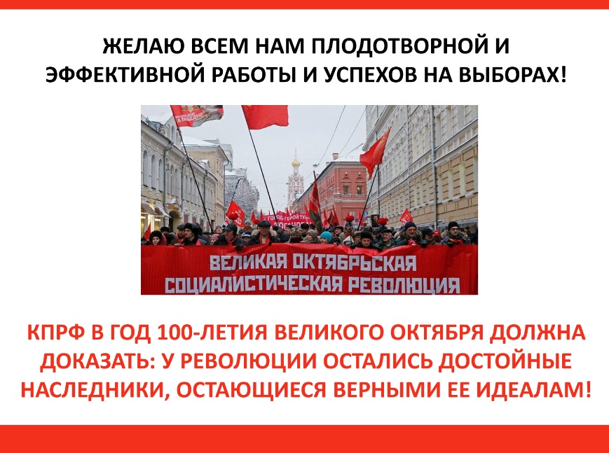 Товарищи! Желаю всем нам плодотворной и эффективной работы по перечисленным направлениям и успехов на предстоящих в этом году и в ближайшие годы выборах! Коммунистическая партия Российской Федерации в год 100-летия Великого Октября должна доказать: у Революции остались достойные наследники, остающиеся верными ее идеалам.
