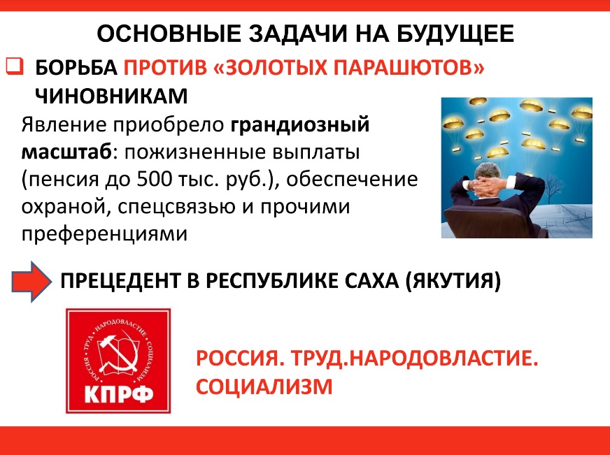 справедливость, важное для партии – это борьба против т.н. «золотых парашютов»