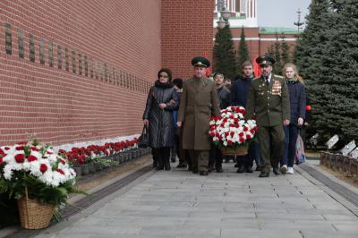 Цветы были возложены к могиле Генералиссимуса И.В. Сталина и к памятнику Маршалу Советского Союза Г.К. Жукову.