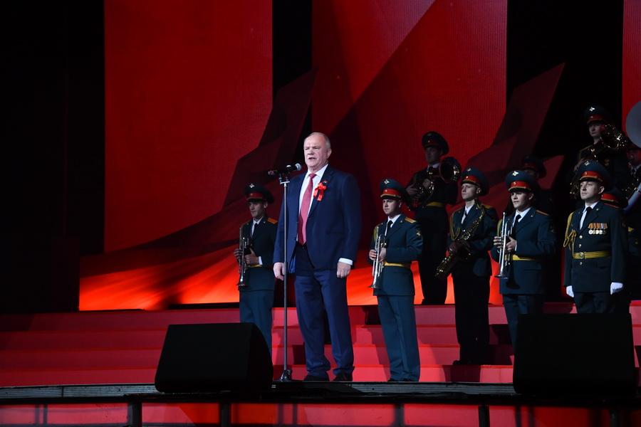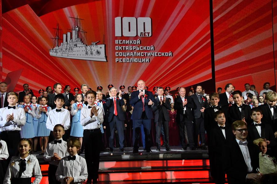 5 ноября в Москве в государственном концертном зале «Россия» состоялся торжественный вечер-концерт, посвященный 100-летию Великой Октябрьской социалистической революции. Зрителей поздравил с наступающим праздником Председатель ЦК КПРФ Г.А. Зюганов: