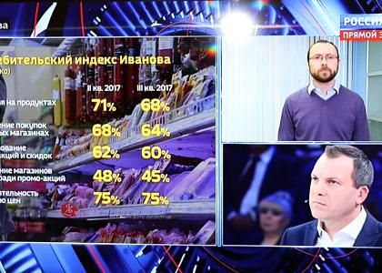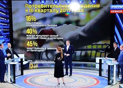 Ведущие программы представили некое социологическое исследование, проведенное Сбербанком, которое выявило, что жизнь средней российской семьи в последнее время несколько улучшилась. Например, если во втором квартале 2017 года на продуктах экономили 71% россиян, то в третьем квартале, согласно исследованию, таких людей стало только 68%, а покупки в самых дешевых магазинах совершают уже не 68, а только 64% наших соотечественников.