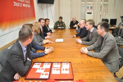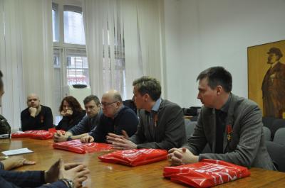Заместитель Председателя ЦК КПРФ Ю. В. Афонин встретился в Санкт-Петербургском горкоме КПРФ с представителями Оргкомитета акции «Три гвоздики к крейсеру «Аврора» и наградил их памятными медалями ЦК КПРФ «100 лет Великой Октябрьской социалистической революции», а также ценными подарками.