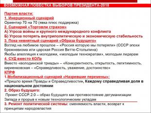 Секретарь ЦК КПРФ привел данные октябрьского всероссийского опроса Центра исследований политической культуры России. В связи с «референдумным» характером выборов 2017 года ЦИПКР поинтересовался у респондентов: а может вместо выборов провести референдум о продлении полномочий Путина? Оказалось, что большинство россиян – против. И это при всех «запредельных» рейтингах «военного вождя». Да, треть респондентов согласна с «референдумным» характером выборов 18 марта 2018 года, а также готова узаконить вместо выборов просто референдум о продлении полномочий Путина. Но, все же относительное большинство – две пятых респондентов – против. Почти половине граждан России нужны настоящие выборы с оппонентами Путину и дебатами. И власть не может не учитывать этот настрой россиян. Отсюда пропагандистская кампания по повышению явки и внушения, что эти выборы будут самые-самые – честные, легитимные и пр.