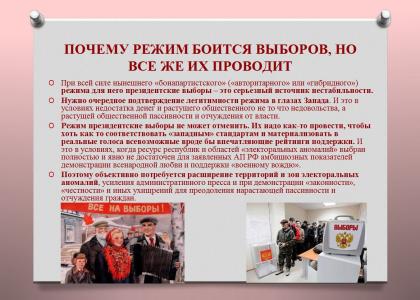 - Режим президентские выборы не может отменить, - подчеркнул С.П.Обухов. - Их надо как-то провести, чтобы хоть как то соответствовать «западным» стандартам и материализовать в реальные голоса всевозможные вроде бы впечатляющие рейтинги поддержки.