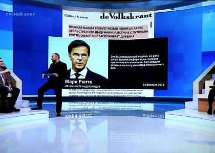 В студии обсуждалось удивительное откровение главы МИД Нидерландов Халбе Зейлстра. Он признался в том, что в свое время приписал президенту России В. В. Путину слова, указывающие на далеко идущие экспансионистские планы России. Ранее Зейлстр утверждал, что в 2006 году, будучи сотрудником транснациональной нефтяной компании Shell, он присутствовал на встрече с Путиным на даче, в ходе которой российский президент якобы сказал, что рассматривает Белоруссию, Украину и Прибалтику в качестве частей «Великой России». А вот теперь Зейлстр признался, что вообще не присутствовал на той встрече, а находился в соседней комнате и никаких слов Путина не слышал.